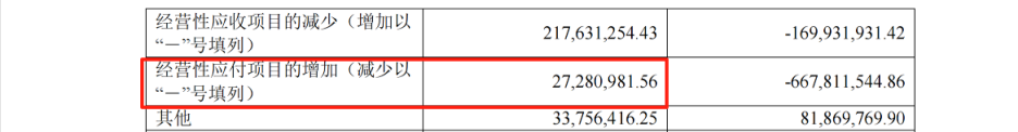 根据现金流量表补充资料,“经营性应付项目的增加(减少以‘-’号填列)”金额为正的2,728万元,这意味着应付项目增加了0.27亿元,对现金流是正贡献(来源:半年报第206页)。然而,翻阅资产负债表,我们发现应付票据和应付账款合计净减少了2.94亿元(应付账款减少3.06亿,应付票据增加0.12亿),这意味着公司实际支付了大量供应商欠款,对现金流应为较大的负贡献。