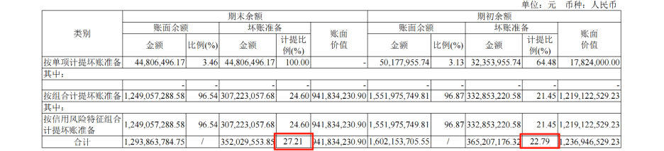 如果说存货或是隐藏成本的“蓄水池”,那么信用减值损失的会计处理可能更像一只调节利润的“魔术手”。报告期内,公司应收账款的信用风险或显著增加,这体现在两个层面:首先,账龄结构“存疑”,2-3年账龄的应收账款余额从2.73亿元增至3.66亿元,增幅达34%(来源:半年报第148页);其次,整体坏账准备计提比例也从期初的22.79%被动上升至期末的27.21%(来源:半年报第149页)。