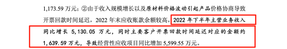 面对如此巨大的现金流“疑问”,发行人给出的核心解释是“由于收入规模增长以及原材料价格波动引起产品价格协商导致开票回款时间延迟,2022年末应收账款余额较高”,并指出其中“主要客户开票回款时间延迟对应的金额约1,639.59万元”。