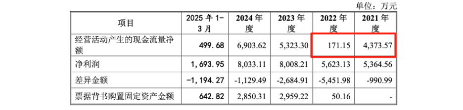 根据《问询函回复》披露,2022年度,在公司净利润同比增长4.82%至5,623.13万元的背景下,其经营活动产生的现金流量净额却从2021年的4,373.57万元断崖式下跌至171.15万元,降幅高达96.09%。即便在剔除票据背书支付设备款等因素影响后,净利润与经营现金流之间的差异缺口依然高达-5,401.82万元,为报告期内最差水平。