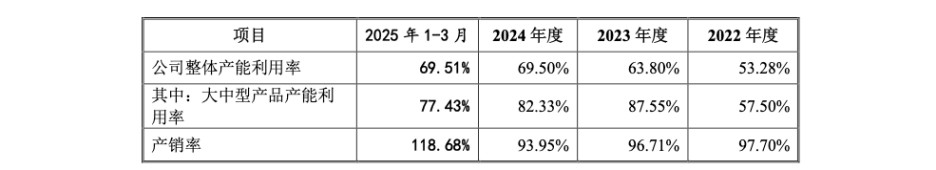 《问询函回复》披露,公司2022年至2025年一季度的整体产能利用率分别为53.28%、63.80%、69.50%和69.51%,始终有约三成的产能处于闲置状态 。尽管公司强调本次募投针对的大中型产品产能利用率较高,但该数据也呈现清晰的下滑趋势,已从2023年的87.55%降至2025年一季度的77.43% 。