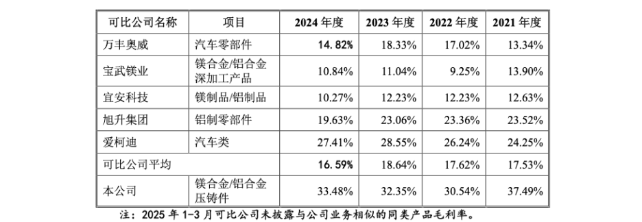 星源卓镁在报告期内展现了远超同行的盈利能力,其压铸件业务毛利率持续显著高于万丰奥威、旭升集团等行业巨头。公司将此归功于“深耕镁合金”、“选择附加值更高的项目”等战略优势。然而,当我们将这一“高光”数据与公司日益加剧的“年降”压力并置分析时,一个“疑问”的逻辑悖论浮出水面。