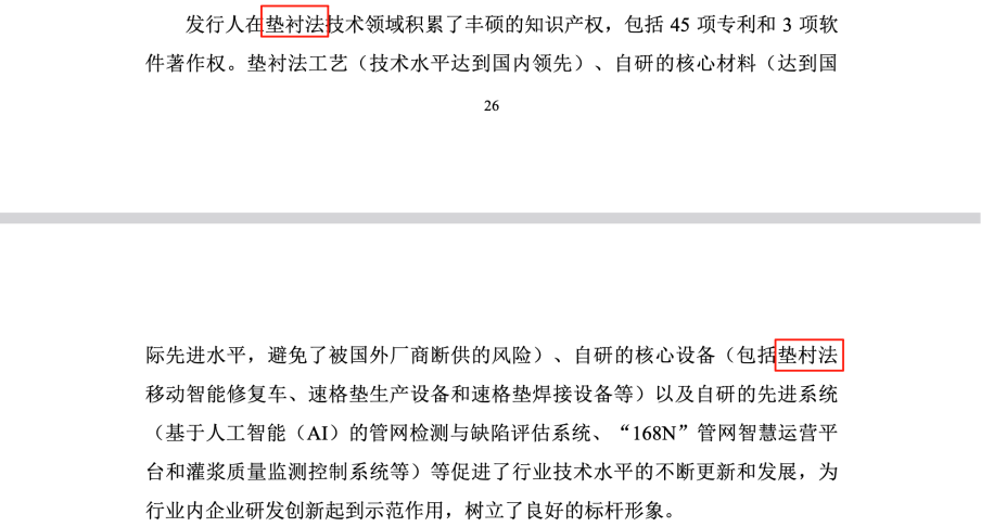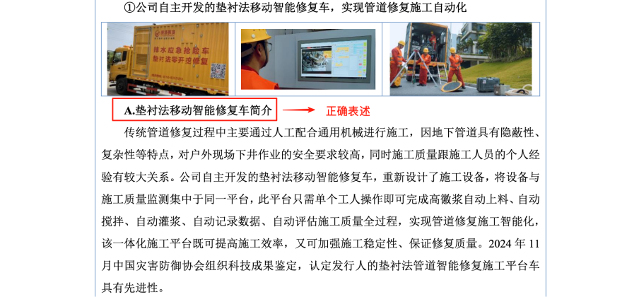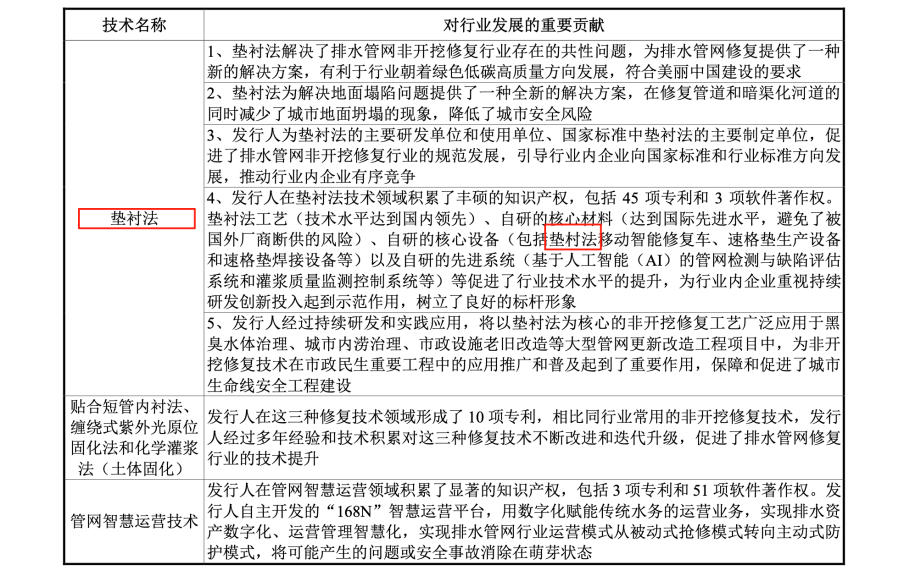 首先,所谓的“核心工法”并非独家技术。招股说明书及问询函回复中均承认,“垫衬法”已被列入国家标准《非开挖修复用塑料管道总则(GB/T 37862-2019)》,属于“行业通用技术”。这意味着任何符合资质的企业都可以依据该国家标准提供垫衬法修复服务,这从根本上削弱了该技术作为核心壁垒的说法。
