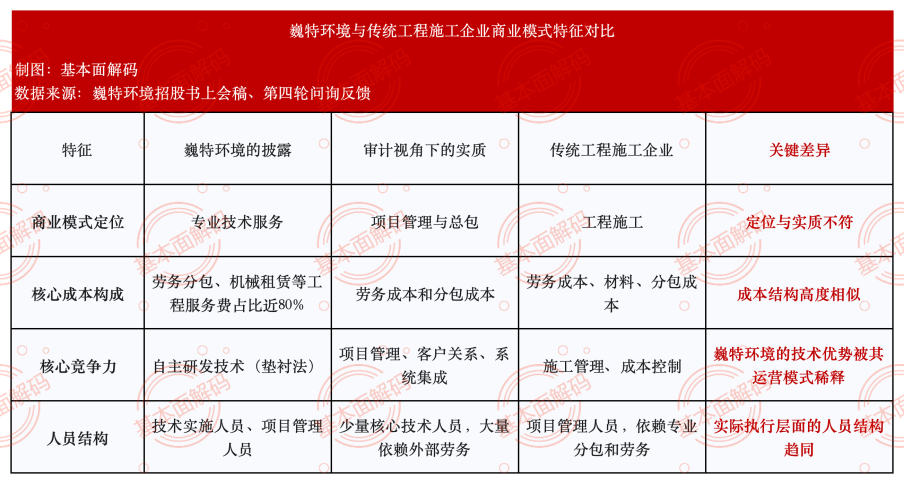 巍特环境在申报文件中或极力将自身塑造为一家以自主研发技术为核心的、轻资产的“专业服务型企业”。然而,基本面解码对其成本结构和业务执行模式的深入剖析揭示了其商业模式的另一面:一个或高度依赖劳务分包、在运营上更接近传统工程承包商的实体。这种定位与实质之间或存矛盾,公司在招股书的对比表中试图从业务场景、技术含量等维度将自身与传统工程施工企业区分开来,然而,最能反映业务实质的成本结构却讲述了不同的故事。