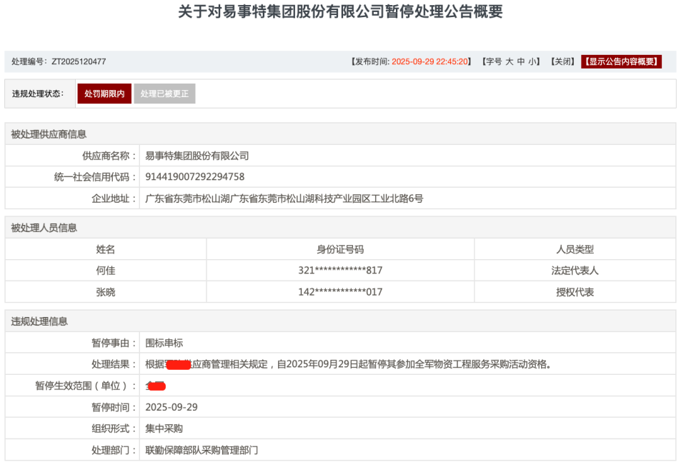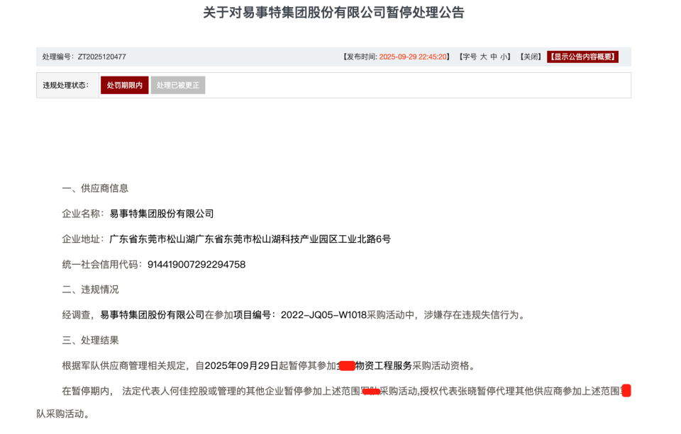 根据联勤保障部队采购管理部门发布的公告(处理编号:ZT2025120477,发布时间:2025年9月29日),易事特在参与项目编号为2022-JQ05-W1018的采购活动中,涉嫌存在围标串标等违规失信行为。依据君队供应商管理相关规定,自2025年9月29日起,易事特被暂停参与全君物资工程服务采购活动资格,暂停范围覆盖 全君,组织形式为集中采购。