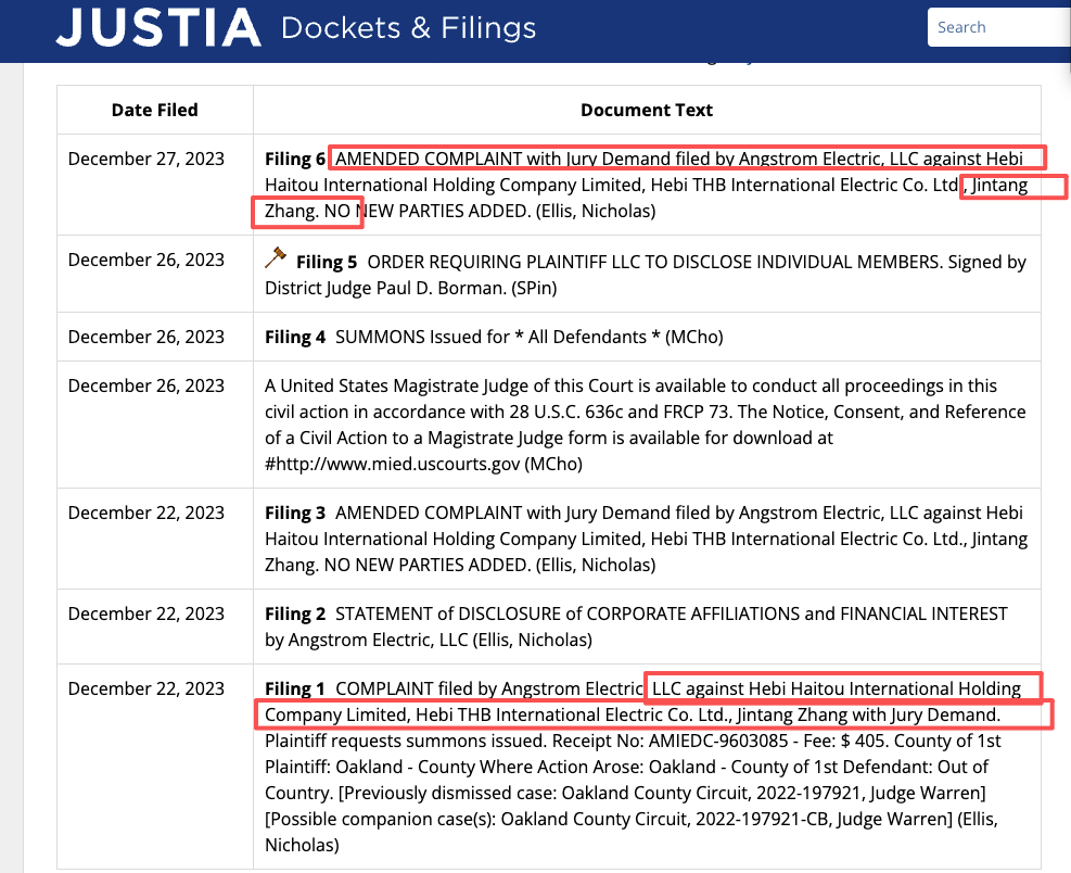 2023年12月22日,原告Angstrom Electric, LLC在美国密歇根州东区联邦地区法院正式提起诉讼(案件编号:2:2023cv13265)。被告方赫然列出了天海电子的核心关联实体:Hebi Haitou International Holding Company Limited(鹤壁海投国际控股有限公司)、Hebi THB International Electric Co. Ltd.(鹤壁天海国际电器有限公司,即天海电子核心子公司)以及Jintang Zhang(张景堂,天海电子原董事长、现任董事)。