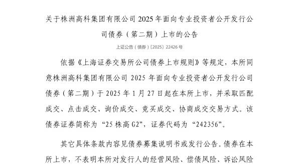 1月24日,上交所发布关于株洲高科集团有限公司2025年面向专业投资者公开发行公司债券(第二期)上市的公告。