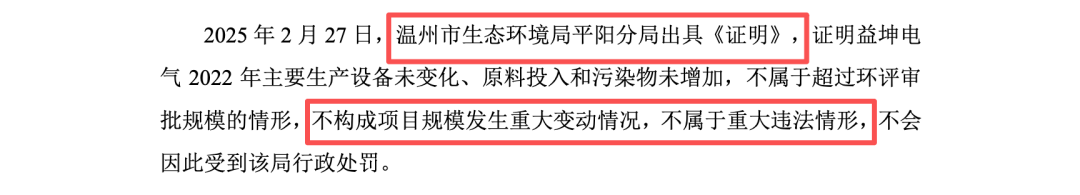 更为关键的是其获取“免死金牌”的操作:2025年2月27日(正值北交所IPO冲刺的冲刺期),温州市生态环境局平阳分局为益坤电气开具了一纸《证明》,确认其2022年“不属于超过环评审批规模的情形,不构成项目规模发生重大变动情况,不属于重大违法情形,不会因此受到该局行政处罚”。同时,平阳县应急管理局也出具了未受到行政处罚的证明。