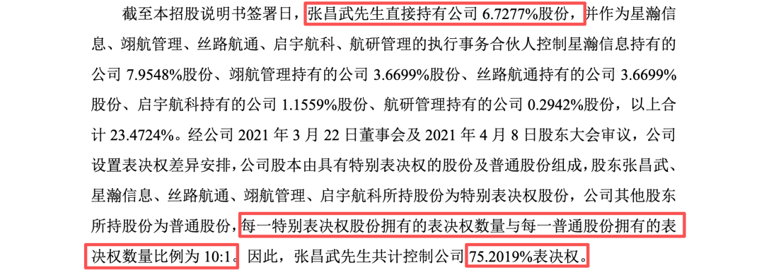 蓝箭航天采用了科创板允许的表决权差异安排(特别表决权)。截至招股说明书签署日,实际控制人张昌武直接持有公司6.7277%的股份,并作为星瀚信息、翊航管理、丝路航通、启宇航科、航研管理等多个持股平台的执行事务合伙人,间接控制部分股份。综合计算,张昌武合计控制公司23.4724%的股份。这种股权设计在商业航天等资本密集型行业中并不罕见,其初衷是为了防止创始团队在多轮巨额融资后丧失对公司的控制权。
