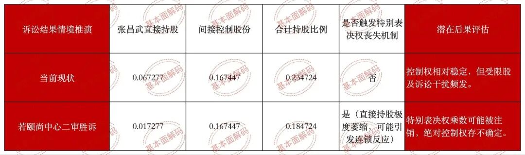 更麻烦的是这5%股权对张昌武控制权地位的数学影响。如前文所述,张昌武目前直接持有的公司股份仅为6.7277%。如果二审法院基于合同契约精神,支持了颐尚中心的诉求,强制执行这5%的直接持股,张昌武的直接持股比例将断崖式下跌至1.7277%。