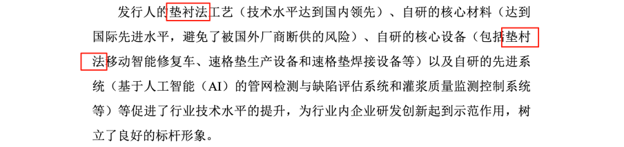 首先,所谓的“核心工法”并非独家技术。招股说明书及问询函回复中均承认,“垫衬法”已被列入国家标准《非开挖修复用塑料管道总则(GB/T 37862-2019)》,属于“行业通用技术”。这意味着任何符合资质的企业都可以依据该国家标准提供垫衬法修复服务,这从根本上削弱了该技术作为核心壁垒的说法。