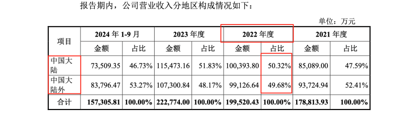 首先,在境内外收入占比这一关键财务数据上,或出现了令人啼笑皆非的错误。《首轮审核问询函回复报告》表格中,赫然列示2022年度“中国大陆外”收入占比为50.32%。但根据《募集说明书》和《首轮审核问询函回复报告》的原始数据(大陆外收入99,126.64万元,总收入199,520.43万元)计算,实际占比应为49.68%。表格中的50.32%实则为“中国大陆内”的收入占比。如此基础的数据标签错误,竟能出现在递交给监管机构的正式文件中,这或不仅是发行人的疏忽,或更是作为“看门人”的兴业证券与上会会计师事务所的失职。