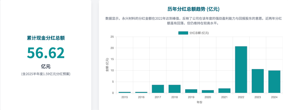 在上市后的最初几年,永兴材料的主营业务聚焦于不锈钢棒线材等特种钢材的研发与生产。这是一个技术成熟、市场竞争激烈、利润率相对稳定的行业。在此期间,公司的分红政策也体现出与行业特征相匹配的稳健与保守。数据显示,从2015年至2020年,公司每年的现金分红总额在1.26亿元至3.60亿元之间波动,整体数额不大。这一时期的分红更像是一种常规性的资本返还,旨在维持对投资者的基本回报承诺,而非一项主动的、战略性的财务工具。分红行为与公司稳健的盈利能力和现金流状况相匹配,具有高度的可预测性。