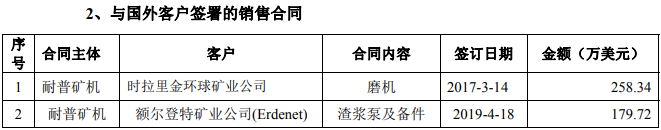 此外,根据招股书披露,在耐普矿机正在履行的大额合同中,包括有对“时拉里金环球矿业公司”的磨机销售合同,金额为258.34万美元,折合人民币高达1700万元以上,签订日期则是在2017年3月,至今已经有近3年时间。这样一宗大额合同,在长达近3年时间里仍然处于正在履行状态,对此耐普矿机也未给出说明,