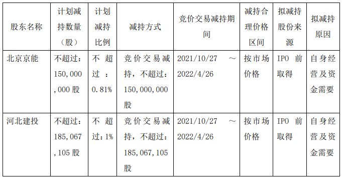 公告显示,北京京能、河北建投减持原因均为自身经营及资金需要,减持价格将按市场价格确定,减持股份来源均为IPO前取得。
