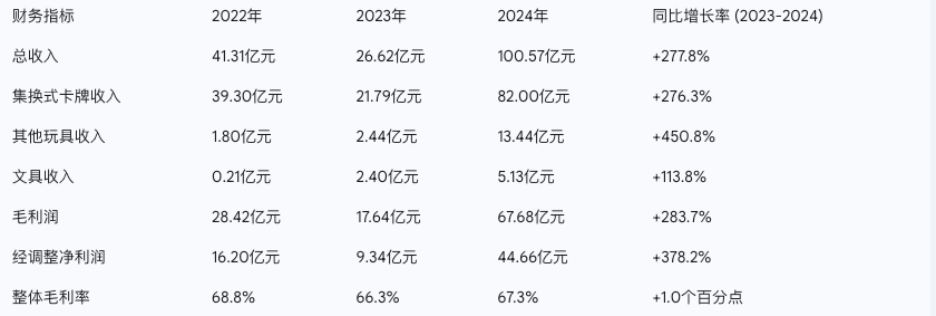 卡游的财务数据显示了爆炸性的增长。公司2024年营收突破100.57亿元人民币,与上一年度相比实现了277.8%的惊人增长。其经调整后的净利润在2024年达到了44.66亿元人民币,整体毛利率67.3%。在中国的集换式卡牌领域,卡游占据了绝对的主导地位,市场份额高达71%。这一财务上的成功是建立在巨大的销售体量之上,仅一年内就售出超过48亿包卡牌。