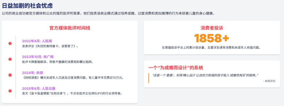 在中国,来自人民日报社、CCTV等国家级媒体的批评,其意义远超普通新闻报道,它往往反映或预示着官方立场和未来可能的监管动向。这些报道或为用户关于该公司产品“毁坏中国青少年健康”的指控,提供了强有力的、得到官方背书的证据。这种公开的谴责给公司带来了巨大的声誉风险和“民生”压力,是监管机构在IPO审查中难以忽视的。这种持续且详尽的报道,很可能不只是媒体的独立行为。