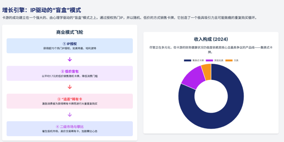卡游的核心业务是销售集换式卡牌,该业务占其总收入的81.5%以上。其商业模式的基石是获得热门知识产权(IP)的授权。截至2024年底,公司已与超过70个知名IP合作,既包括《奥特曼》、《小马宝莉》、《哈利·波特》等国际流行IP,也涵盖了《斗罗大陆》、《哪吒》乃至《卡游三国》等本土文化IP。这些产品以“盲包”形式销售,即包装内的卡牌是随机的,以此激励消费者为集齐稀有卡牌而进行重复购买。产品的定价策略极具渗透性,平均每包售价仅为1.7元人民币,这使得年轻消费者极易接触并开始消费。