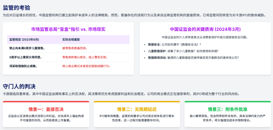 证监会没有将问题局限于市场监管总局职权范围内的金融或赌博风险,而是主动援引了《数据安全法》和《儿童个人信息网络保护规定》,这表明他们已将卡游的业务定性为一个以弱势群体为目标的数据收集实体,而非简单的玩具公司。这种定性或引发了双重担忧:其一,防止数百万中国儿童的敏感数据被一个离岸实体(开曼群岛)控制,这触及了中国数据主权的核心原则;其二,调查这些数据是否被用于建立更有效的、具有心理操纵性的、甚至可能构成剥削的儿童营销模型。这一转变,将IPO的核心挑战从一个消费者保护问题,升级为一个安全和数据治理问题,后者是更难逾越的障碍。