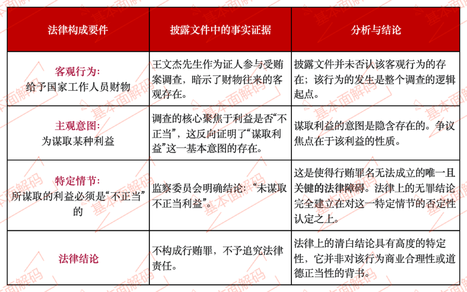 下表通过解构行贿罪的构成要件,清晰地展示了王文杰相关行为的法律评估路径,并凸显了其法律清白结论的狭窄基础: