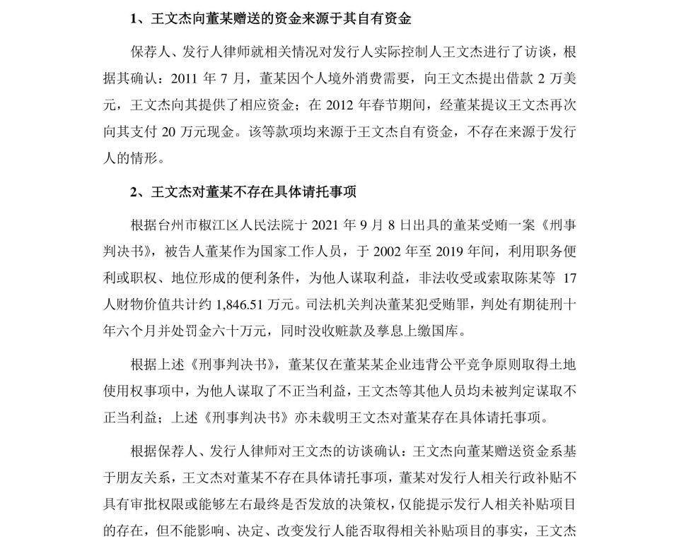 事件性质与过程: 实际控制人王文杰曾以“证人”身份,协助司法机关调查国家工作人员董某利用职务便利非法收受他人财物一案 。此案已于2021年审结,时间点位于本次IPO申报报告期(2022年、2023年和2024年)之前 。