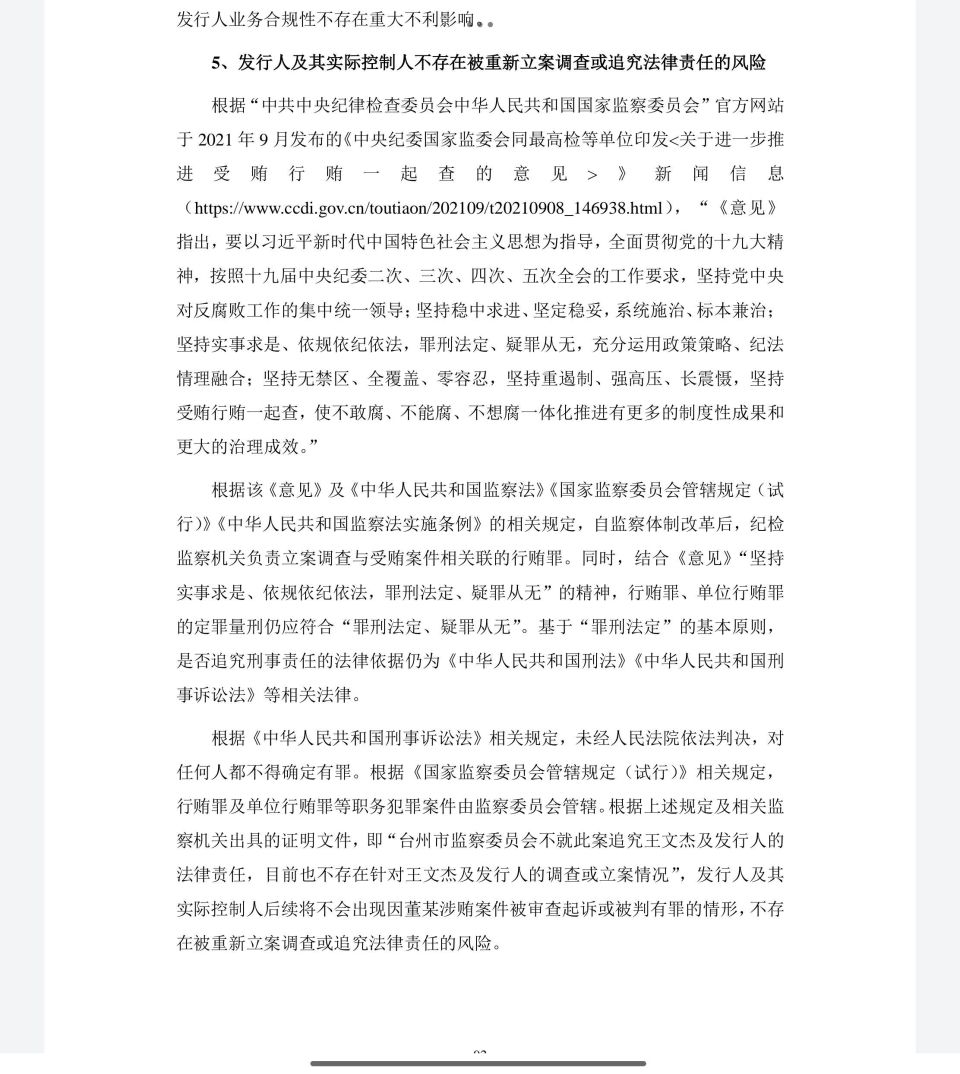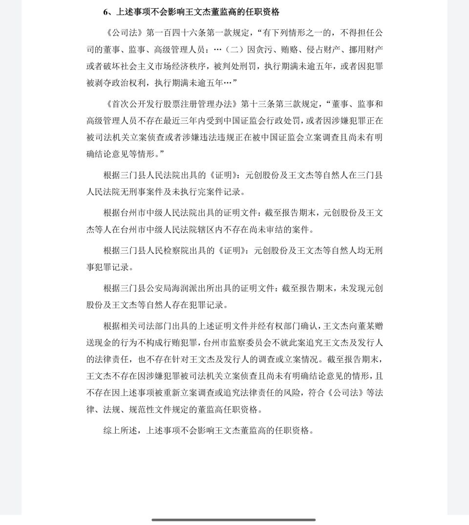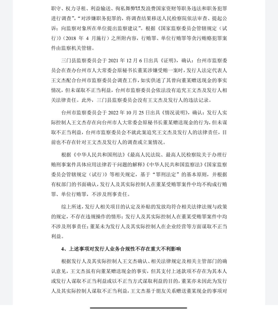 官方结论与文件背书: 针对此事件,三门县监察委员会与台州市监察委员会均出具了书面文件,核心结论是:王文杰先生在此事件中“未谋取不正当利益”,因此监察机关决定不就此案追究王文杰及发行人的法律责任 。为进一步强化合规性证明,发行人还取得了三门县人民法院、台州市中级人民法院、三门县人民检察院及公安机关出具的无刑事案件或犯罪记录的证明 。