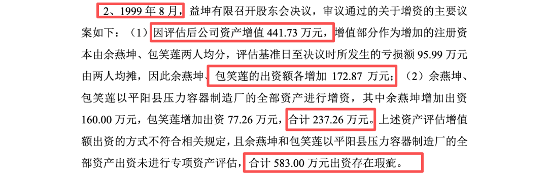 1999年8月,当时的益坤有限召开股东会,或通过了两项违背《公司法》强制性规定的决议: 其一,将未经法定程序确认的441.73万元资产评估增值部分,直接作为增加的注册资本,由余燕坤、包笑莲两人均分(各增加172.87万元),这一行为本质上是将未实现的账面浮盈非法转化为实收资本 4。 其二,余燕坤、包笑莲以“平阳县压力容器制造厂”的全部资产进行增资,其中余燕坤增加出资160.00万元,包笑莲增加出资77.26万元,合计237.26万元。