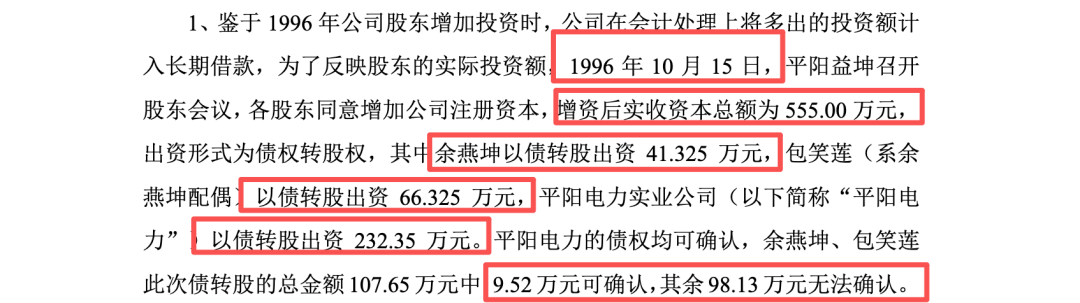 根据监管问询回复披露,1996年10月15日,平阳益坤(益坤电气前身)召开股东会议,决议将实收资本总额增加至555.00万元,出资形式为“债权转股权”。实际控制人余燕坤及其配偶包笑莲分别以债转股出资41.325万元和66.325万元,合计高达107.65万元。