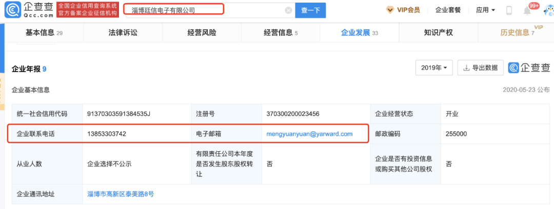 企查查查询淄博廷信2019年显示,社保缴纳人数0人,企业联系电话138****3742邮箱meng****yuan#yarward.com为亚华电子股东孟媛媛(任职发行人财务)私人电话和亚华电子的企业邮箱。