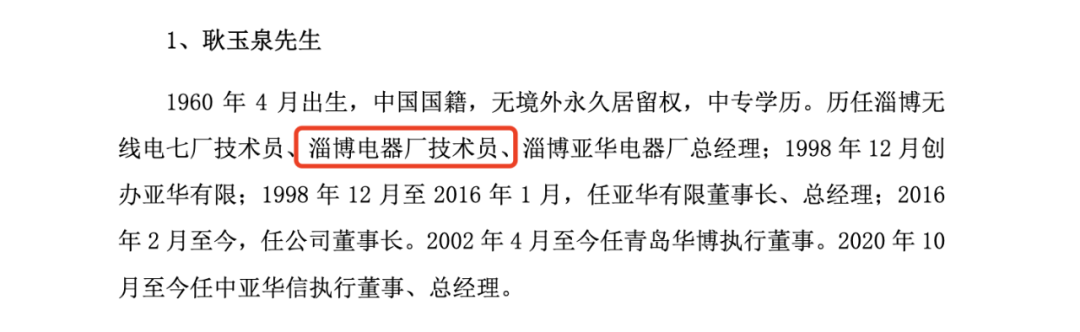 亚华电子招股书(上会稿)显示,耿玉泉1960 年 4 月出生,中国国籍,无境外永久居留权,中专学历。历任淄博无线电七厂技术员、淄博电器厂技术员、淄博亚华电器厂总经理;1998 年 12 月创办亚华有限;1998 年 12 月至 2016 年 1 月,任亚华有限董事长、总经理;2016年 2 月至今,任公司董事长。2002 年 4 月至今任青岛华博执行董事。2020 年 10月至今任中亚华信执行董事、总经理。