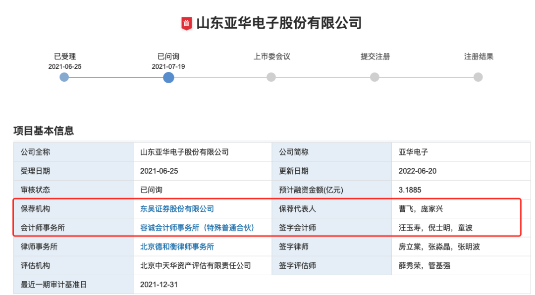 亚华电子保荐机构为东吴证券股份有限公司(以下简称“东吴证券”),保荐代表人曹飞,庞家兴。会计师事务所容诚会计师事务所(特殊普通合伙)签字会计师汪玉寿,倪士明,童波。咨询机构中改一云。