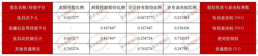 然而,通过10:1的特别表决权放大机制,张昌武以相对较低的直接与间接持股比例,实际控制了公司高达75.2019%的表决权。