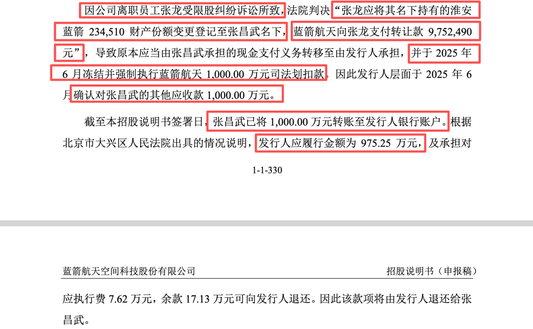 在严监管态势下,拟上市企业在申报前夕(2025年6月正处于IPO冲刺的关键期)仍发生实际控制人或通过司法划扣变相占用公司资金的事件,是否证明了蓝箭航天的财务结算系统与大股东之间缺乏最基本的防火墙?尽管招股书随后辩称张昌武已将1000万元转账至蓝箭航天银行账户予以归还,且法院说明余款将退还给蓝箭航天,最终再由蓝箭航天退还给张昌武,但这纯粹是东窗事发后的“事后补救”。