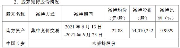 公告显示,长安汽车于2021年5月22日披露了《控股股东及一致行动人减持股份预披露公告》(公告编号:2021-53),公司控股股东中国长安计划在上述公告发布之日起十五个交易日后的6个月内,以集中竞价和大宗交易方式减持公司股份不超过5439.59万股(即不超过公司总股本的1%),南方资产计划在上述公告发布之日起十五个交易日后的6个月内,以集中竞价和大宗交易方式减持公司股份不超过1.09亿股(即不超过公司总股本的2%)。