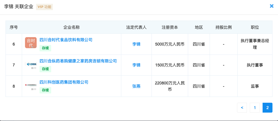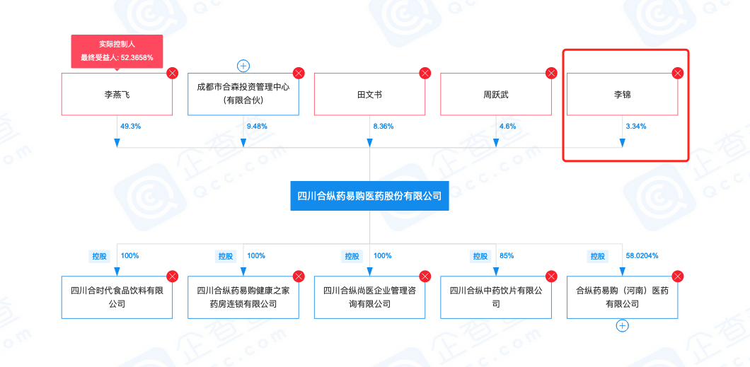 公司董事李锦则为实控人李燕飞之弟及一致行动人,他持有240万股公司股份,占公司总股本的3.34%,目前为公司的第八大股东,同时他还在药易购的控股子公司四川合纵药易购健康之家药店连锁有限公司、四川合纵尚医企业管理咨询有限公司、四川药易达物流有限公司、四川合时代食品饮料有限公司、四川合纵中药饮片有限公司担任法人代表。