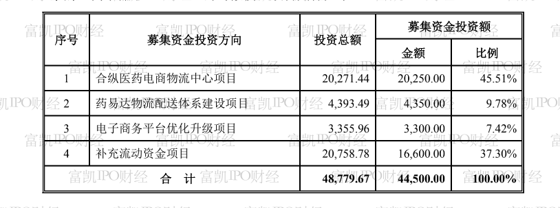 四川合纵药易购医药股份有限公司是一家做“院外市场”的医药流通综合服务商,简单的讲药易购是从医药生产商运来药物,然后送向社区医药中心、基层医疗机构等地方。本次合纵药易购拟公开发行新股不超过2391.67万股(占发行后公司股份总数的25.00%),保荐机构为申万宏源证券承销保荐有限责任公司。药易购本次拟募集资金4.45亿元,分别用于合纵医药电商物流中心项目、药易达物流配送体系建设项目、电子商务平台优化升级项目、补充流动资金项目。