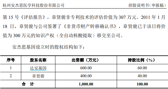 根据招股书披露,安杰思前身为“杭州安杰思基因科技有限公司”, 由中山大学达安基因股份有限公司与章贤骏合计出资1000万元,于2010年12月联合设立,其中章贤骏出资400万元、所占股份比例为40%,包括知识产权出资300万元。