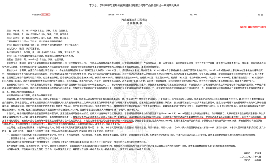 经梳理,裁判文书网2020年9月29日发布河北省玉田县人民法院民事判决书(2020)冀0229民初1333号,案号显示“玉田县公安局交通警察大队出具道路交通事故认定书认定郭玉嘉负事故同等责任,李恩福负事故同等责任。事故认定书中认定李恩福无证驾驶无号牌轻便二轮摩托车,因涉案爱玛电动车被鉴定为机动车,而李恩福在购买电动车时不能联想到机动车,故被告对李恩福无证驾驶应承担责任,因被告(爱玛科技)产品存在缺陷,增加了车辆的危险性,被告(爱玛科技)的产品存在缺陷与李恩福发生交通事故存在一定的因果关系,本院酌定被告爱玛公司对原告损失承担15%赔偿责任。”