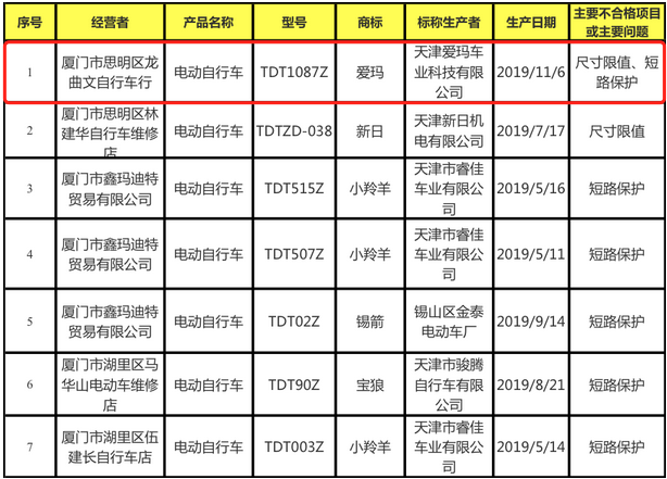 爱玛科技不仅存在产品缺陷同时被多地市场监督管理局因抽查质量不合规被通报。厦门市市场监督管理局发布2019年电动自行车产品质量抽查情况,在抽查的26批次产品中,有7批次电动自行车不合格,不合格项目主要集中在尺寸限值和短路保护。爱玛有1批次产品上了黑榜产品被点名。天津爱玛车业科技有限公司生产的爱玛电动自行车(型号:TDT1087Z;生产日期:2019/11/6),尺寸限值和短路保护两个项目不达标。