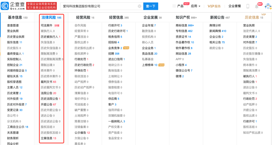 特别值得警惕的是,爱玛科技隐瞒产品存在缺陷致他人死亡在招股书未做任何披露,这更使该公司涉嫌隐瞒重大不利信息。富凯IPO财经通过企查查梳理爱玛科技相关资料发现,爱玛科技法律风险高达185条,涉及人身损害赔偿、产品瑕疵、冻结、商标侵权、侵权产品等。