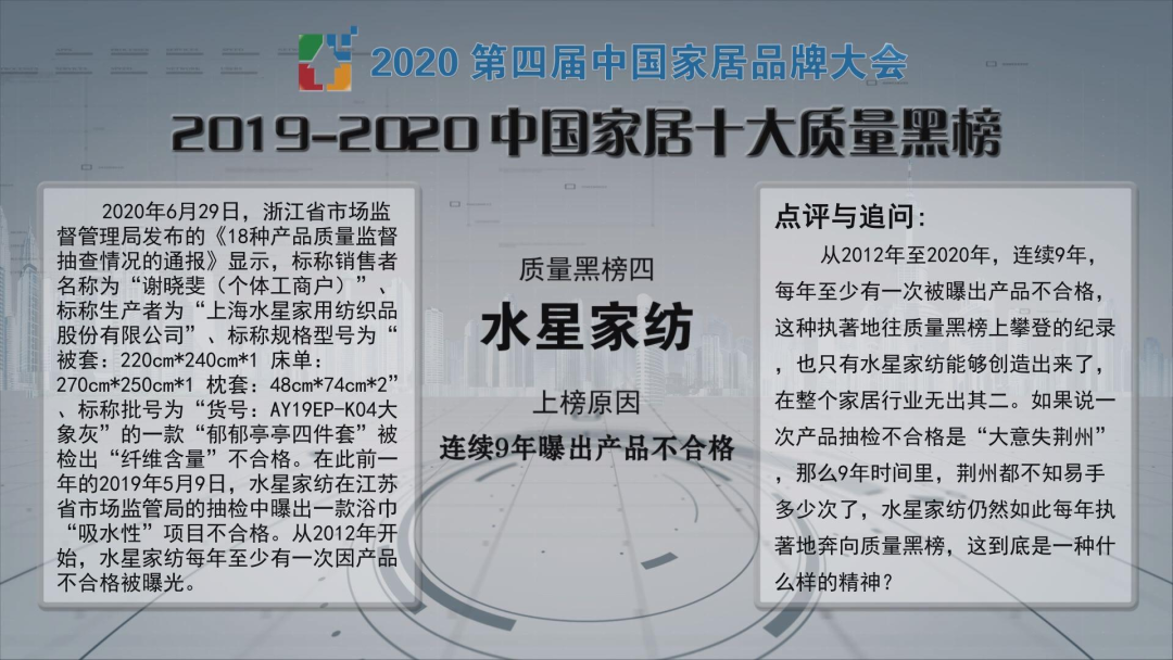 这样的不合格产品的“斑斑劣迹”,不仅让水星家纺所谓的“人无我有、人有我优”屡遭打脸,更是直接“助力”该公司登上了2020第四届中国家居品牌大会“2019-2020中国家居十大质量黑榜”。