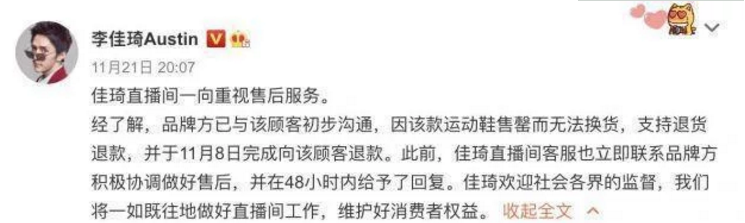 李佳琦发布声明回应称,消费者曾在11月6日将问题反映给品牌方和李佳琦直播间,厂商因为当时货品已售完无法换货,11月8日,已经进行了退款。李佳琦方面称,直播间一直与品牌方积极协调做好售后,如果对目前的售后解决方案仍有意见,会负责到底。