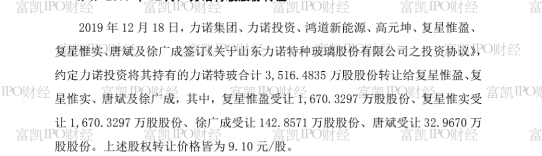 富凯IPO财经发现力诺特玻IPO前夕股东“突击入股”。2019年12月18日,力诺集团、力诺投资、鸿道新能源、高元坤、复星惟盈、复星惟实、唐斌及徐广成签订《关于山东力诺特种玻璃股份有限公司之投资协议》,约定力诺投资将其持有的力诺特玻合计3,516.4835万股股份转让给复星惟盈、复星惟实、唐斌及徐广成,其中,复星惟盈受让1670.3297万股股份、复星惟实受让1670.3297万股股份、徐广成受让142.8571万股股份、唐斌受让32.9670万股股份。上述股权转让价格皆为9.10元/股。